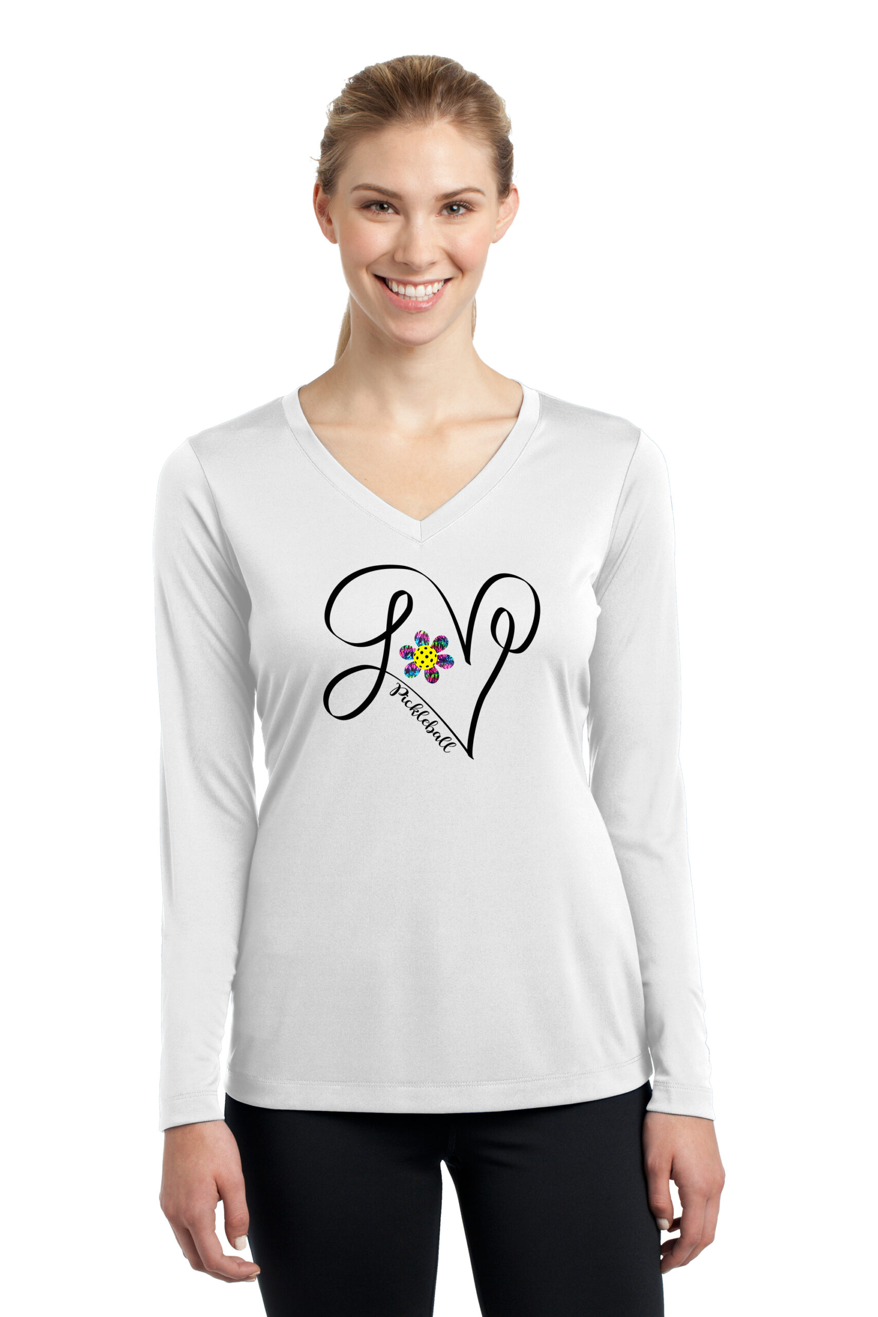 This long sleeve shirt is perfect for those chilly morning or evening pickleball play dates. Or anytime in the sun to protect your arms from harmful rays. Lightweight, moisture wicking and a comfortable ladies fit make it a must have for your pickleball wardrobe. The colorful Love Heart Pickleball logo is a fun way to tell everyone that you love pickleball!